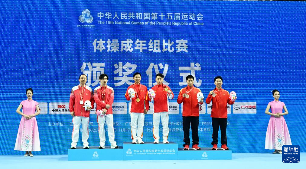 11月14日,亚军湖南队选手张博恒(左三)、冠军四川队选手邹敬园(右四)和第三名江苏队选手尤浩(右二)以及教练们在颁奖仪式上。